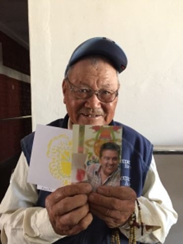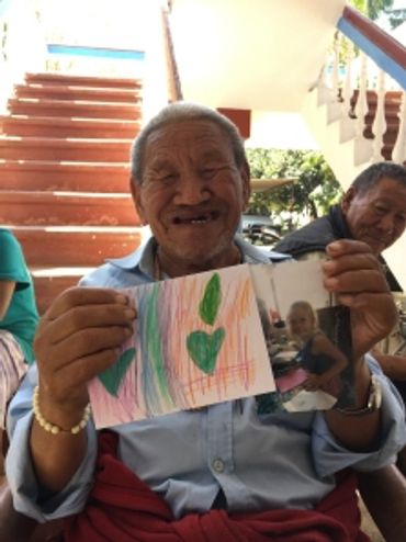 In January 2017 we visited the elders in Bylakuppe on Losar, Tibetan New Year and gave each person a card that was handmade by our family members and friends. This was a special day for all of us. There was so much love and joy put into making the cards and the elders were so happy to receive them, and especially liked the photos of the person who made each card. Personal connections were established between the elders and the friends and family members who have supported them over the past seven years! The elders offered prayers of thanks and a few even sang songs for the donors.